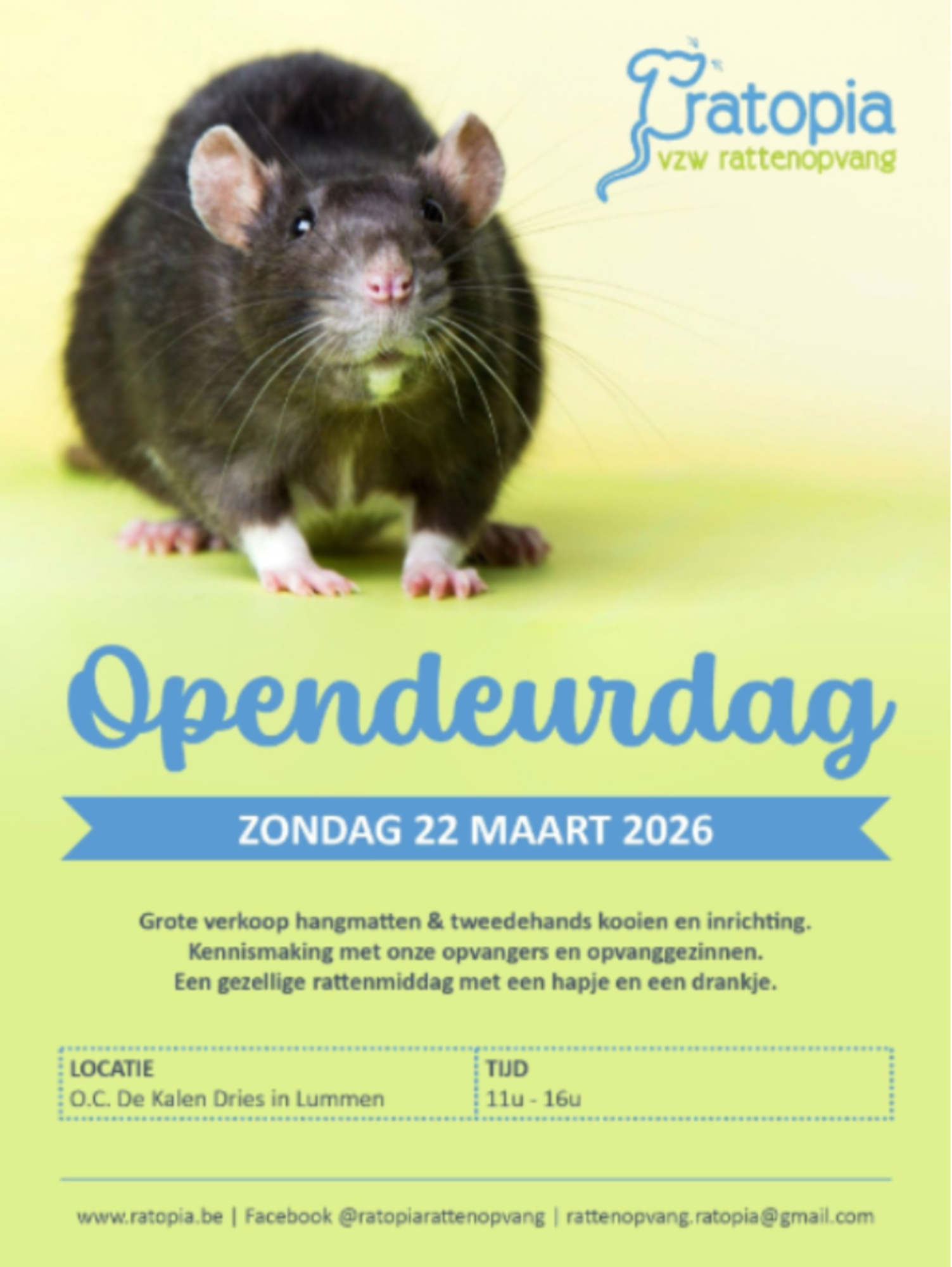 VZW Rattenopvang Ratopia is een vrijwilligersorganisatie met als doel tamme ratjes een tweede kans te geven. De diertjes komen omwille van zeer uiteenlopende redenen binnen. Het is onze taak om deze diertjes, indien nodig, mentaal en fysiek erbovenop te helpen en ze vervolgens te herplaatsen bij een geschikt baasje. Ons tweede doel is mensen correct informeren over het houden van deze leuke dieren.